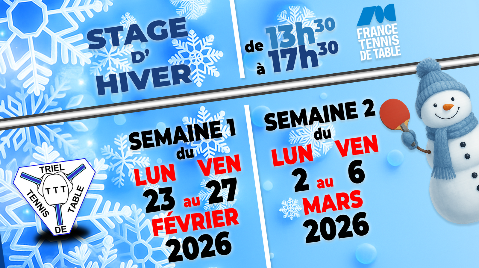 - 1 semaine inscrit au club de Triel TT : 60 €